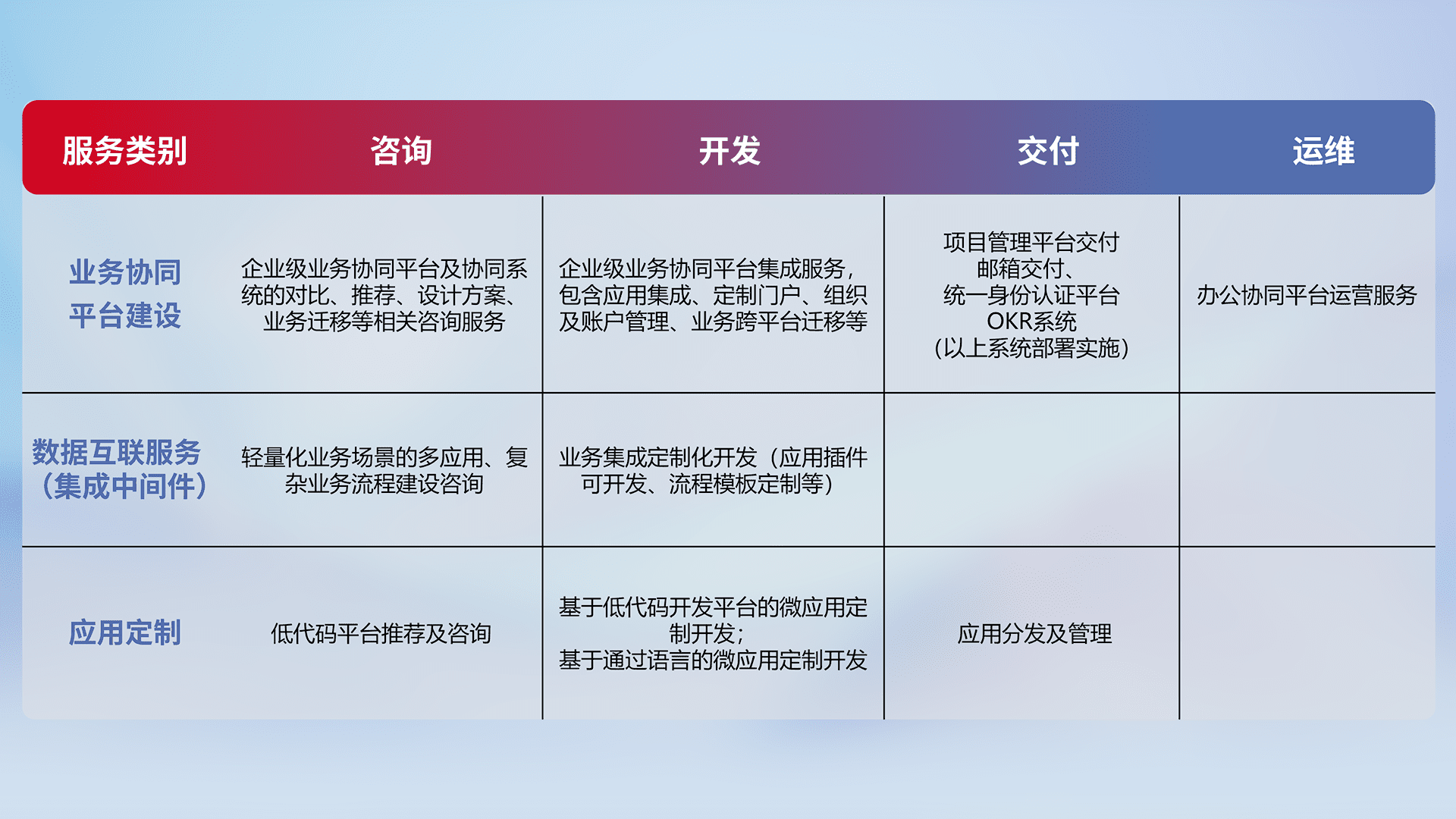 针对钉钉、、企微、、、IDaas等平台级产品提供产品的规划、、、、方案、、交付、、、、定制化开发等服务,,实现如统一协同办公、、、、智能客户服务、、、混合会议管理、、、、智能数据查询、、、、等业务场景,,,,实现数字化转型。。。。
